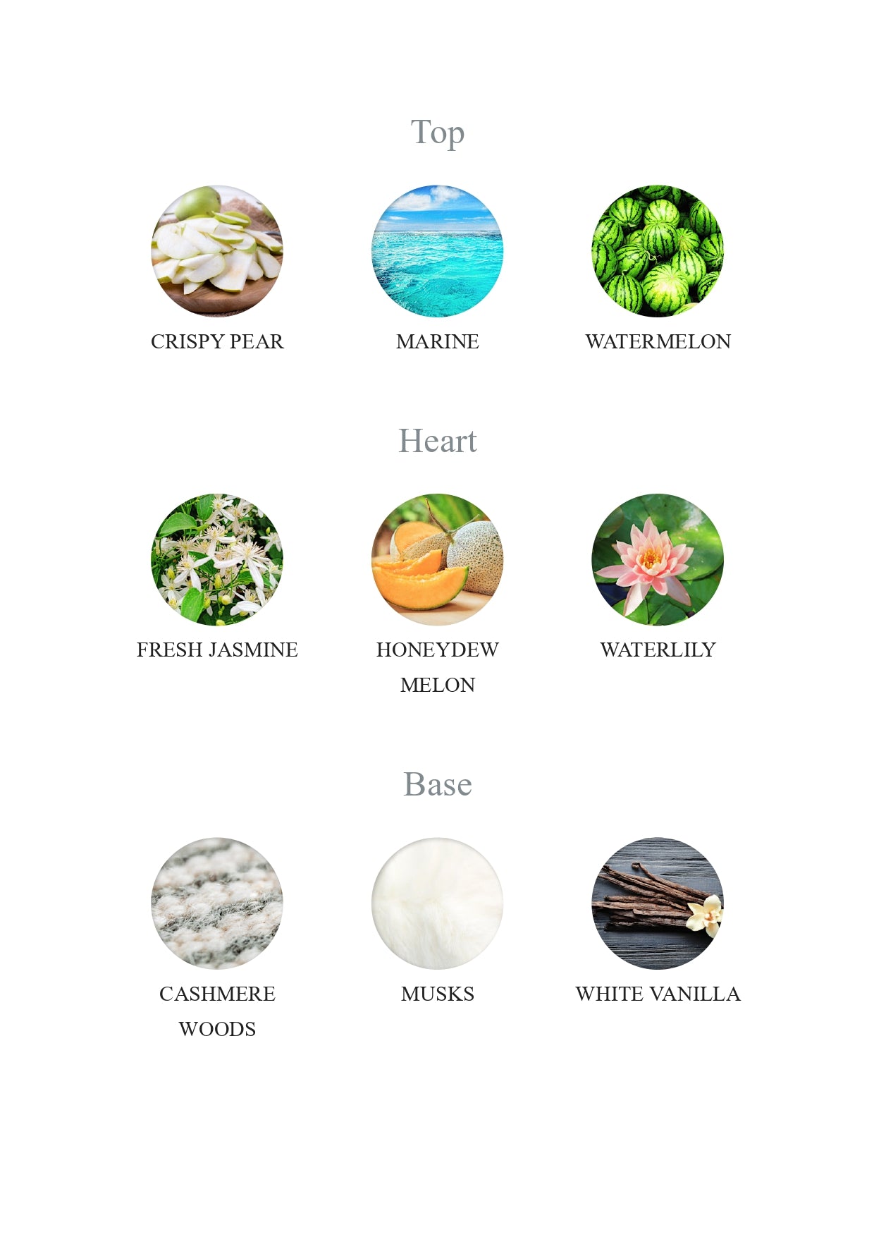 - Augšējās notis: Kraukšķīgs bumbieris, Jūras svaigums, Arbūzs