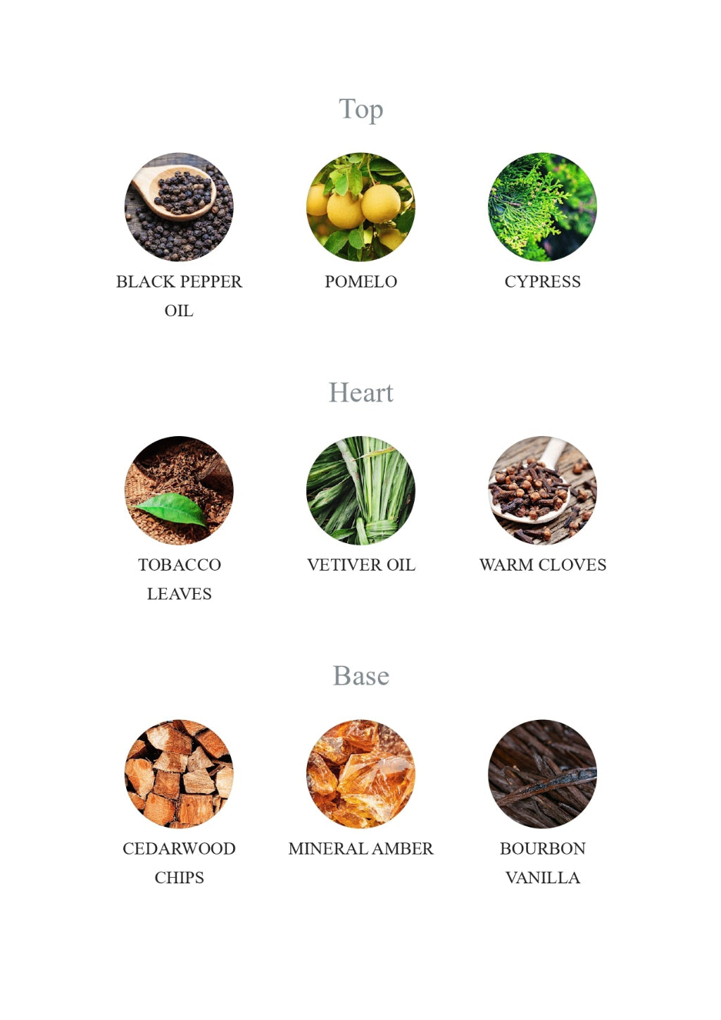 Augšējās notis: Melno piparu ēteriskā eļļa, Pomelo, Ciprese