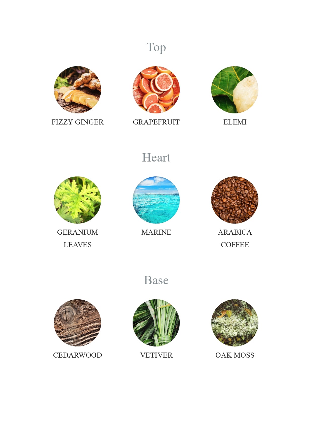 Augšējās notis: Dzirkstošais ingvers, Greipfrūts, Elemi sveķi
